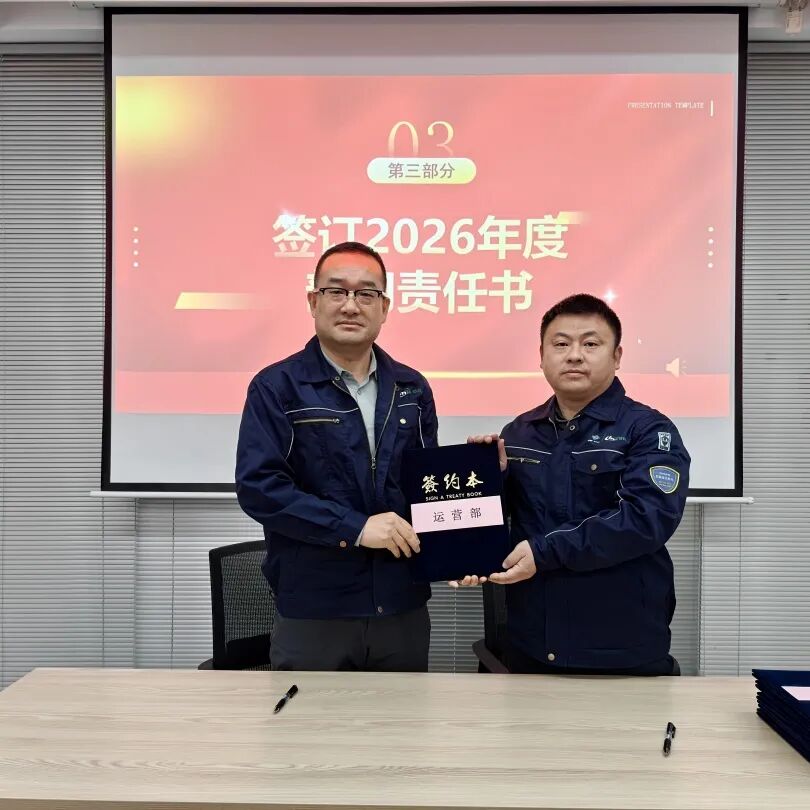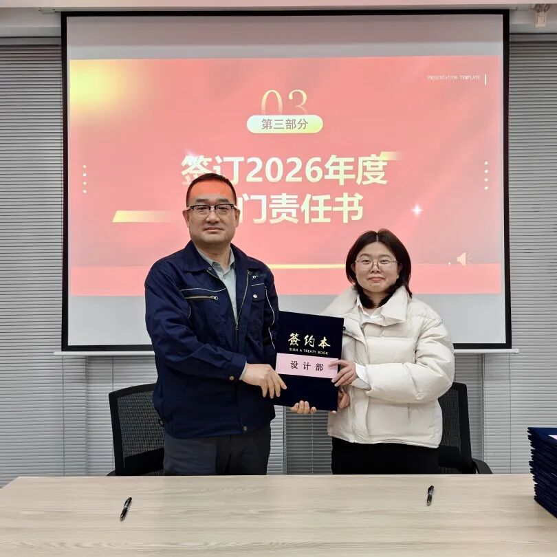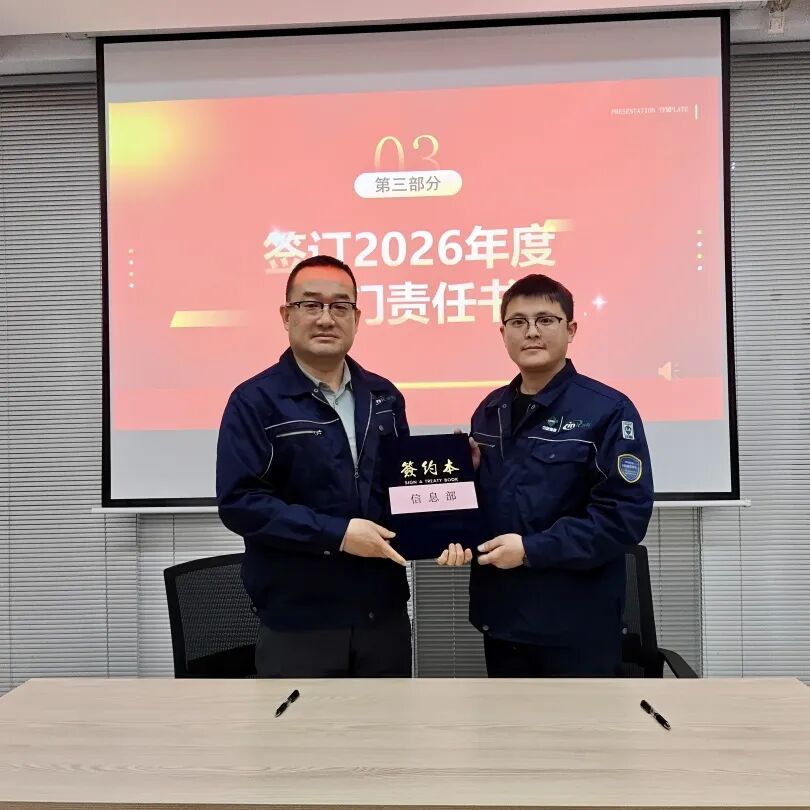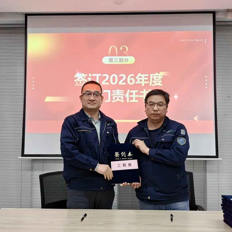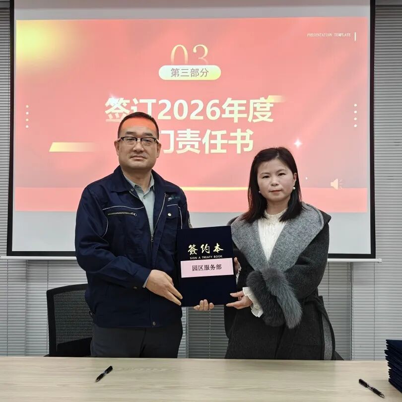 为明确 2026 年各部门工作目标,推动公司精细化管理落地,大会举行2026年度部门责任书签订仪式。公司总经理与技术研发部、设计部、工程部、园区服务部、运营部、环境管家部、安全部、采购部、信息部、人事行政部等各部门负责人依次签订责任书,将年度工作目标与责任层层分解、落实到人。