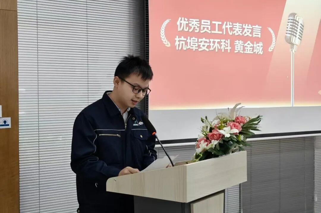 优秀员工代表黄金城分享:自己近九年深耕安环岗位,从浅层认知到深刻理解安全环保重要性的成长历程,坦言这份荣誉属于整个安环团队,也离不开全体同事的参与和配合,并表示将以更饱满的热情、更严谨的态度打磨自己,在安环岗位继续坚守前行。