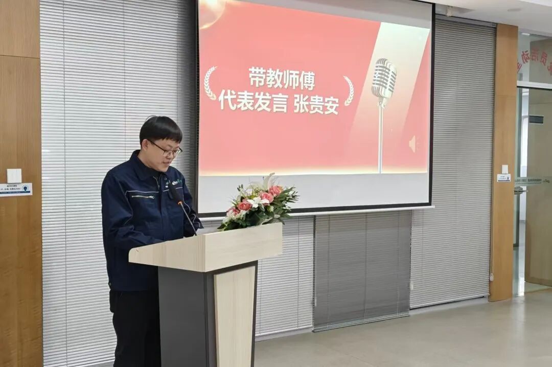 带教师傅代表张贵安分享:蚌埠污水站带新人的过程中,坚持吃透标准、明确要求,因材施教、扬长补短,以人为本、融入团队,切实做好传帮带,同时实现了个人管理与技术能力的提升,并将继续为公司培育人才、聚力赋能。